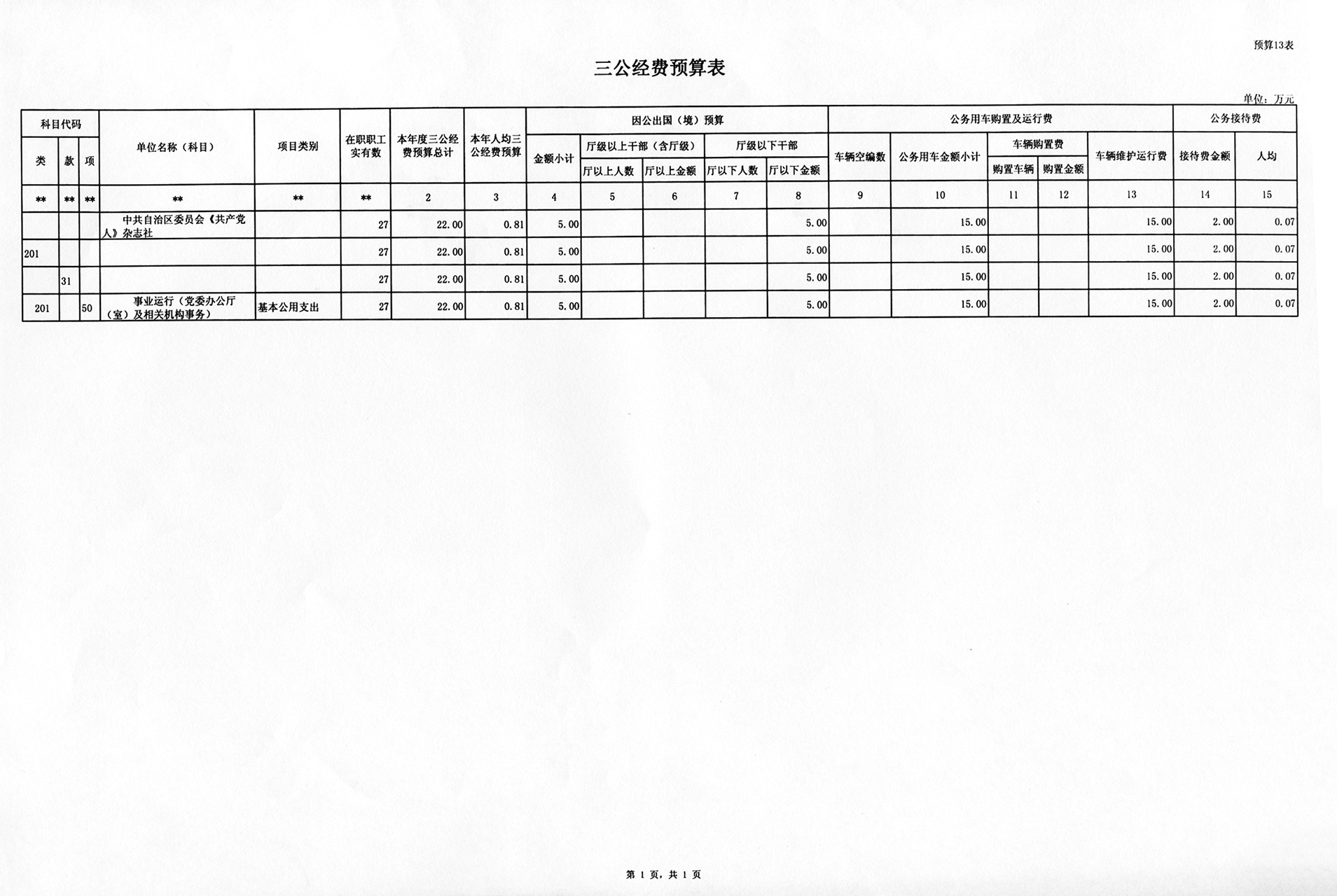 2015年單位預(yù)算總指標(biāo)為328.58萬(wàn)元。其中:基本支出預(yù)算指標(biāo)為291.58萬(wàn)元,項(xiàng)目支出預(yù)算指標(biāo)為37萬(wàn)元?;局С觥叭苯?jīng)費(fèi)預(yù)算總計(jì)22萬(wàn)元,與2014年“三公”經(jīng)費(fèi)預(yù)算持平,無(wú)增減變化。其中:因公出國(guó)(境)預(yù)算5萬(wàn)元。公務(wù)用車(chē)購(gòu)置費(fèi)為0,公務(wù)用車(chē)運(yùn)行費(fèi)15萬(wàn)元。公務(wù)接待費(fèi)2萬(wàn)元。詳見(jiàn)附表。