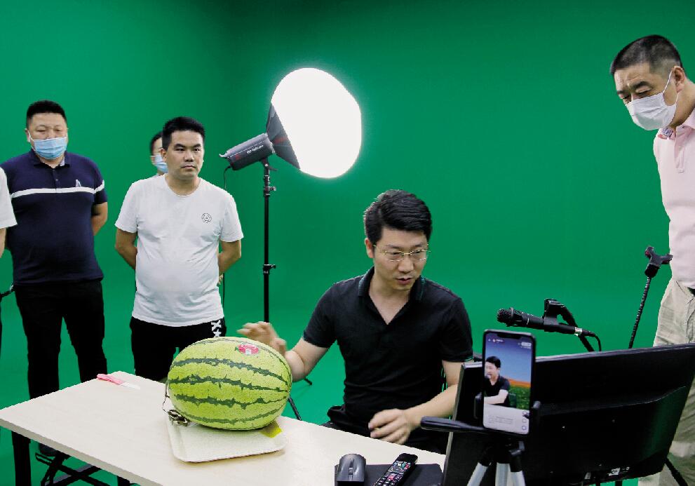 寧夏中衛(wèi)硒砂瓜直播周,??碗娚讨辈セ貫V布直播間將寧夏中衛(wèi)硒砂瓜田投影在大背景上,使人身臨其境猶如親手采摘。