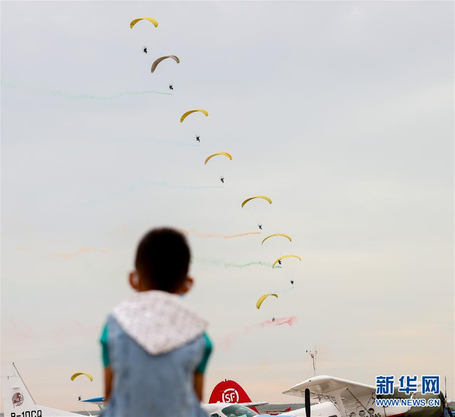 8月14日,表演者在開幕式上進(jìn)行動力傘飛行表演。