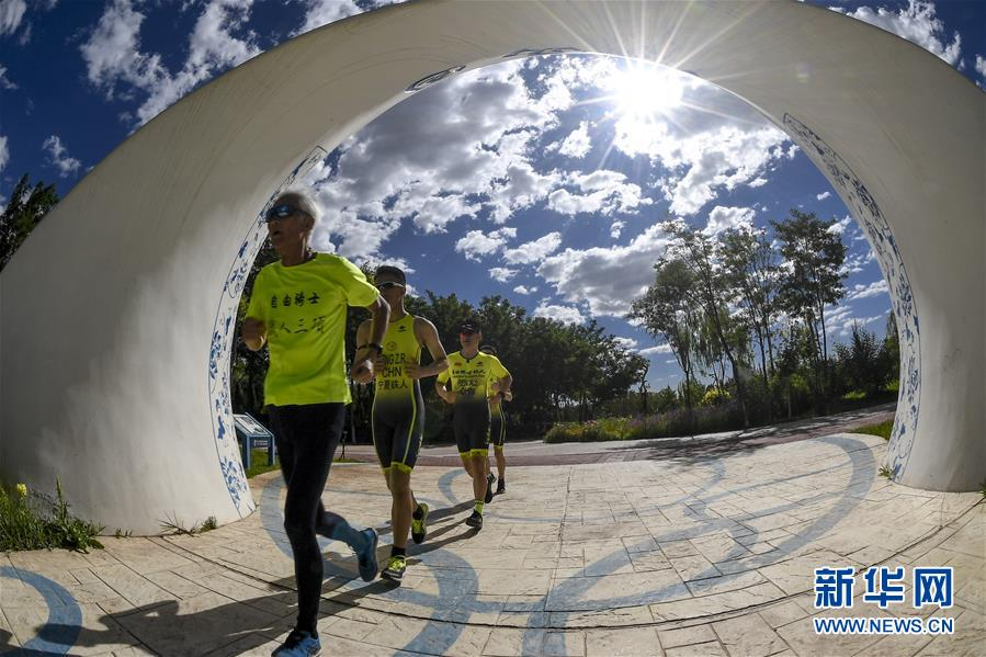 在寧夏銀川,顧大我(中)與鐵人三項(xiàng)俱樂(lè)部的隊(duì)友們一起進(jìn)行跑步訓(xùn)練(7月26日攝)。 新華社記者 馮開(kāi)華 攝