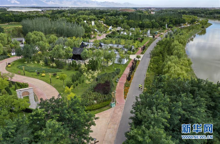 在寧夏銀川花博園,顧大我與鐵人三項(xiàng)俱樂(lè)部的隊(duì)友們一起進(jìn)行跑步訓(xùn)練(無(wú)人機(jī)照片,7月26日攝)。 新華社記者 馮開(kāi)華 攝