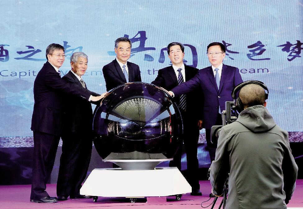 梁振英(左三)、陳潤兒(左四)、崔波(左二)、中央廣播電視總臺副臺長蔣希偉(右一)和農(nóng)業(yè)農(nóng)村部總經(jīng)濟師魏百剛(左一)共同為博覽會啟幕