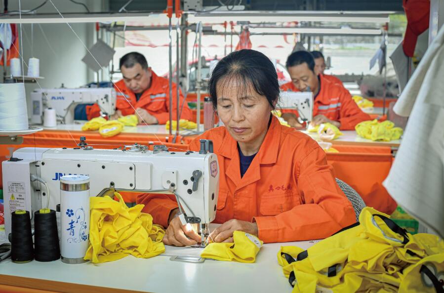 平利縣老縣鎮(zhèn)錦屏社區(qū)的社區(qū)工廠,工人在加工襪子