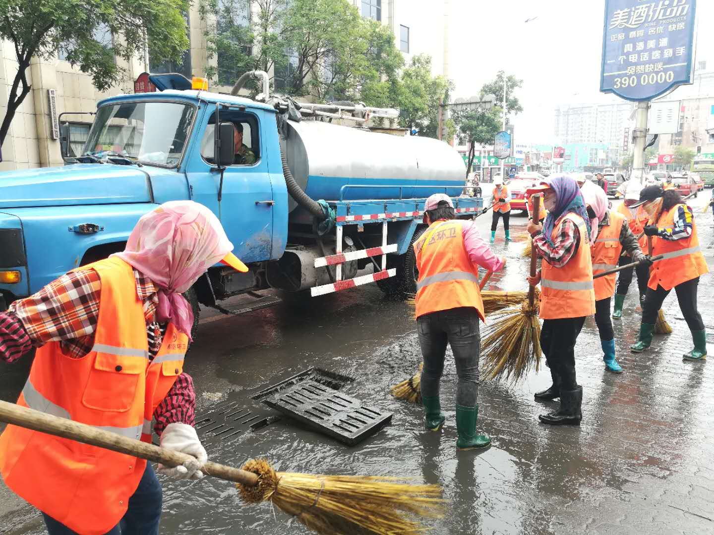 2020年9月13日下午17點(diǎn)左右,惠農(nóng)區(qū)突降暴雨,主城區(qū)街路出現(xiàn)多處大面積積水。各組組長(zhǎng)迅速組織人員,拿上鐵鍬、掃帚冒雨清理路段積水和淤泥,不見(jiàn)路面干凈不回家,一直干到深夜,直到路面恢復(fù)正常、無(wú)淤泥,環(huán)衛(wèi)工人才拖著疲憊的身軀回家休息。