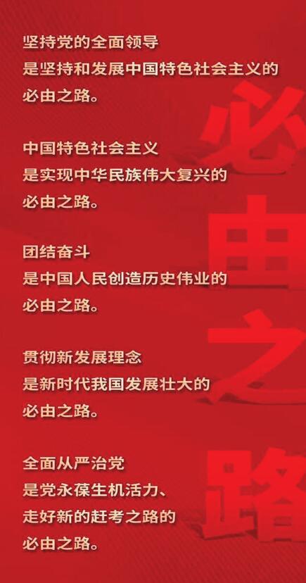 “五個(gè)必由之路”是對(duì)中國(guó)發(fā)展大勢(shì)的精辟總結(jié),為新時(shí)代治國(guó)理政提供了科學(xué)的思想方法和方法論指導(dǎo),我們要倍加珍惜、深刻領(lǐng)會(huì),長(zhǎng)期堅(jiān)持、豐富發(fā)展?!皥?jiān)持黨的全面領(lǐng)導(dǎo)是堅(jiān)持和發(fā)展中國(guó)特色社會(huì)主義的必由之路”,從堅(jiān)持和發(fā)展中國(guó)特色社會(huì)主義的戰(zhàn)略高度,強(qiáng)調(diào)了黨的全面領(lǐng)導(dǎo)的重要意義,進(jìn)一步深化了我們對(duì)中國(guó)共產(chǎn)黨的領(lǐng)導(dǎo)是中國(guó)特色社會(huì)主義最本質(zhì)的特征的認(rèn)識(shí),對(duì)于深刻領(lǐng)悟堅(jiān)持中國(guó)共產(chǎn)黨領(lǐng)導(dǎo)的歷史必然性具有重要意義。“中國(guó)特色社會(huì)主義是實(shí)現(xiàn)中華民族偉大復(fù)興的必由之路”,宣示了舉什么旗、走什么路的問題,中國(guó)特色社會(huì)主義道路植根中國(guó)大地、反映人民意愿,承載著幾代中國(guó)共產(chǎn)黨人的理想和信念,寄托著無數(shù)仁人志士的夙愿和期盼,凝聚著億萬人民的奮斗和希望,是引領(lǐng)中國(guó)發(fā)展進(jìn)步的唯一正確道路,是創(chuàng)造人民美好生活、實(shí)現(xiàn)中華民族偉大復(fù)興的康莊大道。“團(tuán)結(jié)奮斗是中國(guó)人民創(chuàng)造歷史偉業(yè)的必由之路”,回答了實(shí)現(xiàn)中華民族偉大復(fù)興奮斗目標(biāo)必須具備的精神狀態(tài)問題,在經(jīng)濟(jì)全球化深入發(fā)展的今天,每個(gè)國(guó)家發(fā)展都要同時(shí)面對(duì)外部壓力和內(nèi)部各種復(fù)雜敏感問題,只有牢牢把握?qǐng)F(tuán)結(jié)奮斗這一成功密碼,才能萬眾一心、攻堅(jiān)克難,向著第二個(gè)百年奮斗目標(biāo)堅(jiān)定前行?!柏瀼匦掳l(fā)展理念是新時(shí)代我國(guó)發(fā)展壯大的必由之路”,系統(tǒng)解答了新時(shí)代如何發(fā)展的問題,新發(fā)展理念闡明了我們黨關(guān)于發(fā)展的政治立場(chǎng)、價(jià)值導(dǎo)向、發(fā)展模式、發(fā)展道路等重大問題,體現(xiàn)了實(shí)現(xiàn)國(guó)家富強(qiáng)民主文明和諧美麗的本質(zhì)要求,成為馬克思主義發(fā)展觀的當(dāng)代形態(tài)。“全面從嚴(yán)治黨是黨永葆生機(jī)活力、走好新的趕考之路的必由之路”,是中國(guó)共產(chǎn)黨人砥礪初心和使命的實(shí)踐詮釋,回答的是如何鍛造堅(jiān)強(qiáng)領(lǐng)導(dǎo)的問題,只有堅(jiān)持不懈把全面從嚴(yán)治黨向縱深推進(jìn),以偉大自我革命引領(lǐng)偉大社會(huì)革命,不斷增強(qiáng)黨的自我凈化、自我完善、自我革新、自我提高能力,才能永葆旺盛生命力和強(qiáng)大戰(zhàn)斗力。