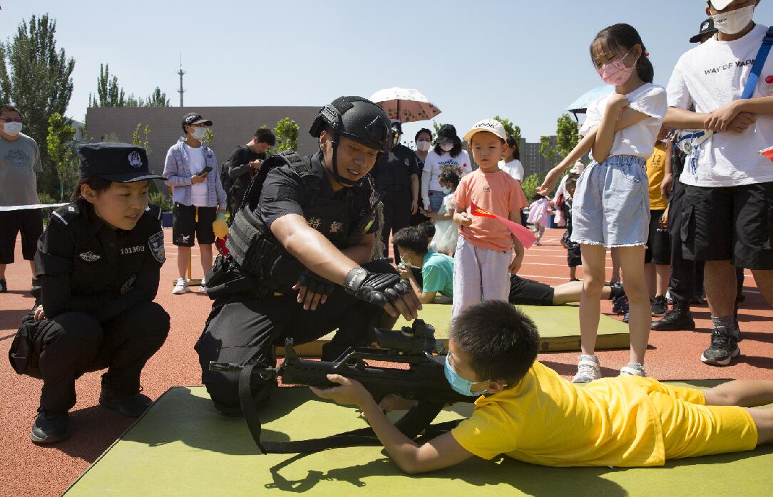 在“向人民報(bào)告”警營(yíng)開放日活動(dòng)中,銀川市公安局特警支隊(duì)野狼突擊隊(duì)民警帶領(lǐng)群眾體驗(yàn)特警武器裝備。