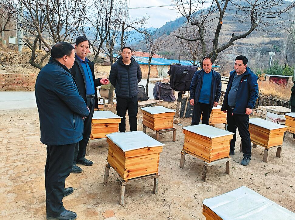高應(yīng)廣(左一)查看蜜蜂養(yǎng)殖情況