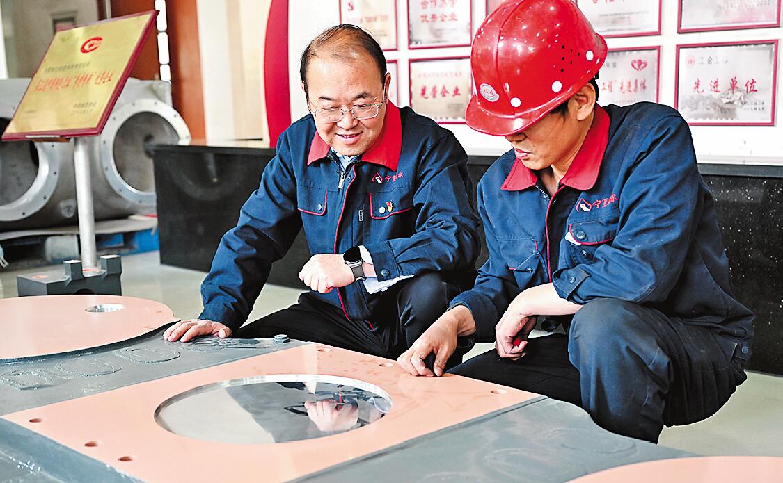 寧夏維爾鑄造有限責(zé)任公司董事長王小寧(左)查看公司研發(fā)的中國標(biāo)準(zhǔn)高速動(dòng)車組大型鋁合金零部件。閆院平/攝