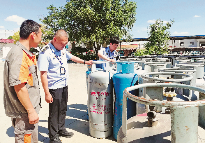 吳忠市市場(chǎng)監(jiān)督管理局執(zhí)法人員檢查企業(yè)召回的“雙閥”液化石油氣鋼瓶報(bào)廢情況。