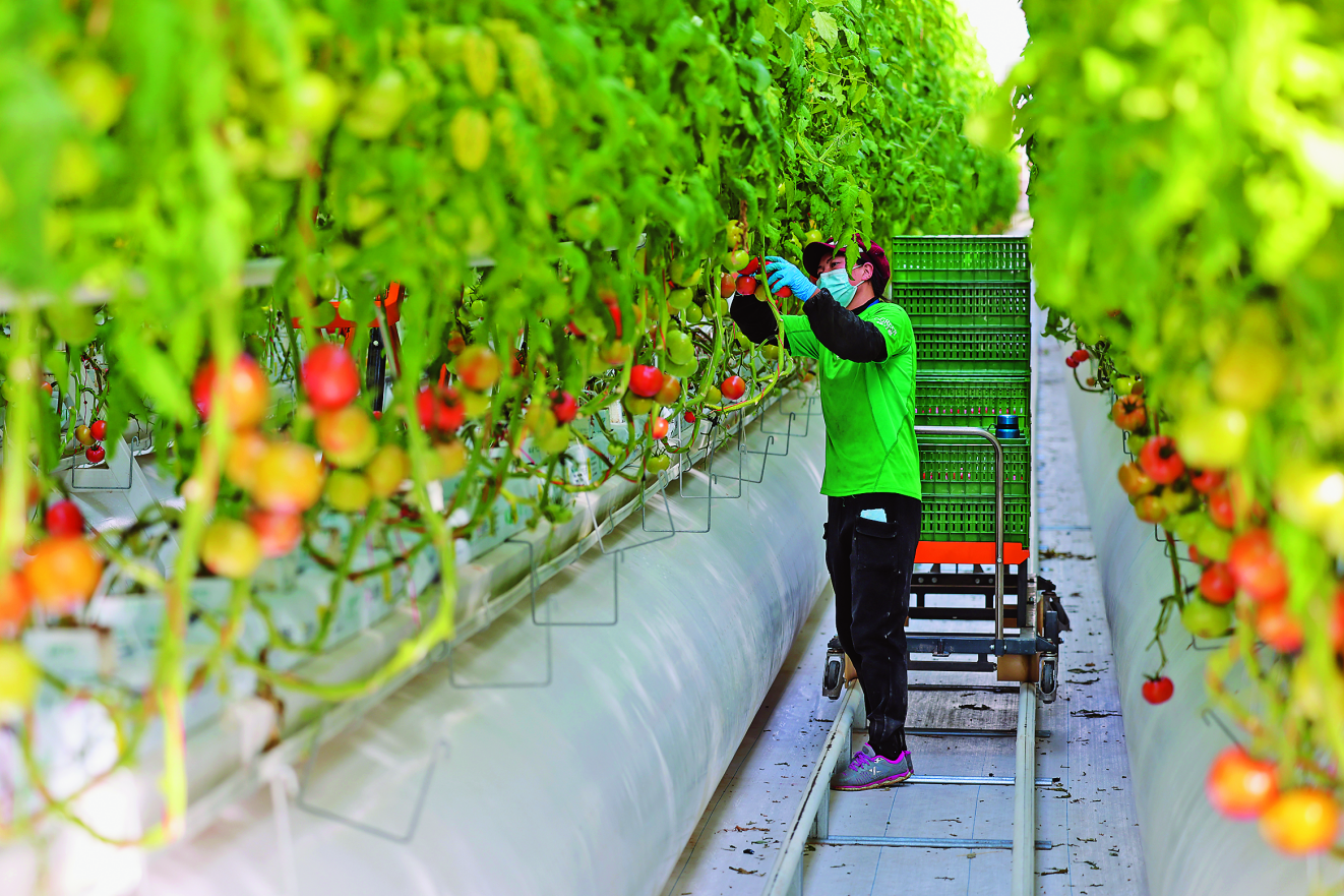走進(jìn)閩寧鎮(zhèn)凱盛(銀川)現(xiàn)代智慧農(nóng)業(yè)產(chǎn)業(yè)園,一排排紅綠相間的西紅柿掛滿枝頭,身著統(tǒng)一工裝的工人們站在軌道車上穿梭其間,正在采摘成熟的番茄。負(fù)責(zé)人介紹,該產(chǎn)業(yè)園是寧夏布局的首個(gè)半封閉智慧溫室農(nóng)業(yè)項(xiàng)目,采取無土栽培、電腦控制溫室環(huán)境等方式,產(chǎn)業(yè)園所有的基層管理人員、基層工人都來自閩寧鎮(zhèn)。