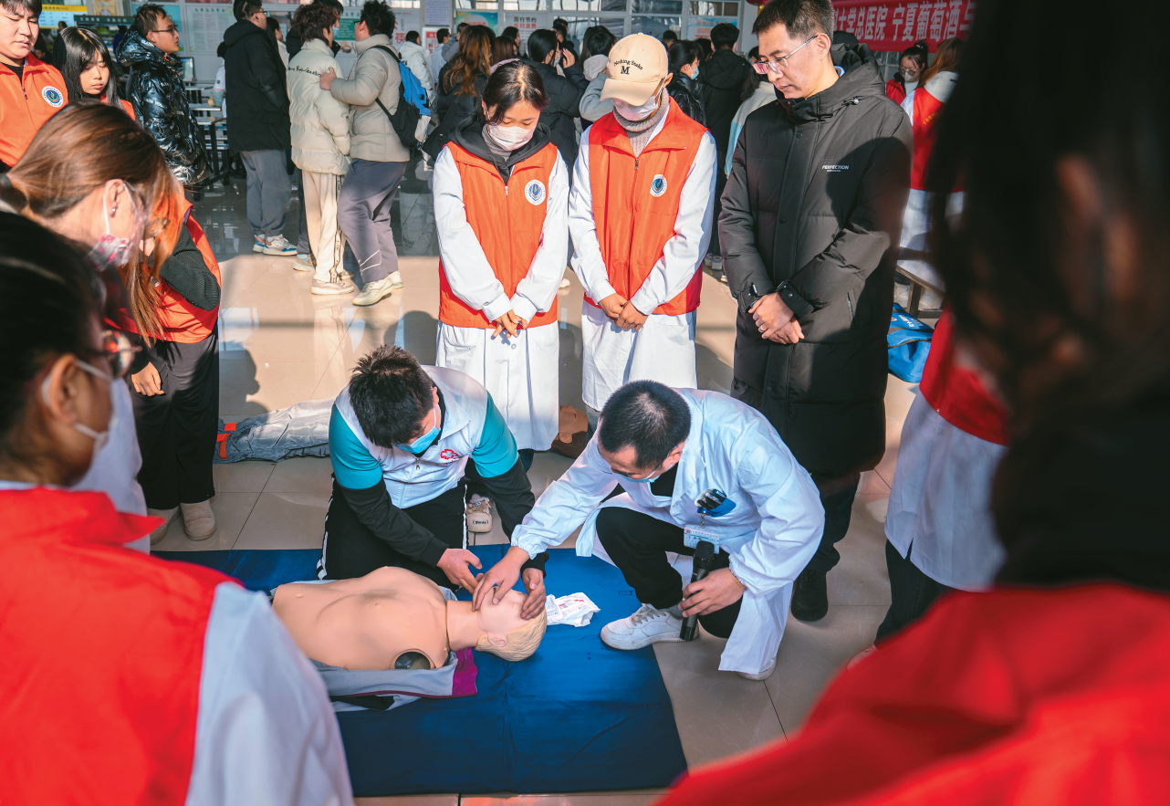 寧夏醫(yī)科大學(xué)總醫(yī)院急診科青年醫(yī)生組建心肺復(fù)蘇知識(shí)普及志愿服務(wù)隊(duì),到社區(qū)和高校開(kāi)展心肺復(fù)蘇志愿服務(wù)培訓(xùn),提升居民和學(xué)生的急救能力。?寧夏醫(yī)科大學(xué)總醫(yī)院供圖