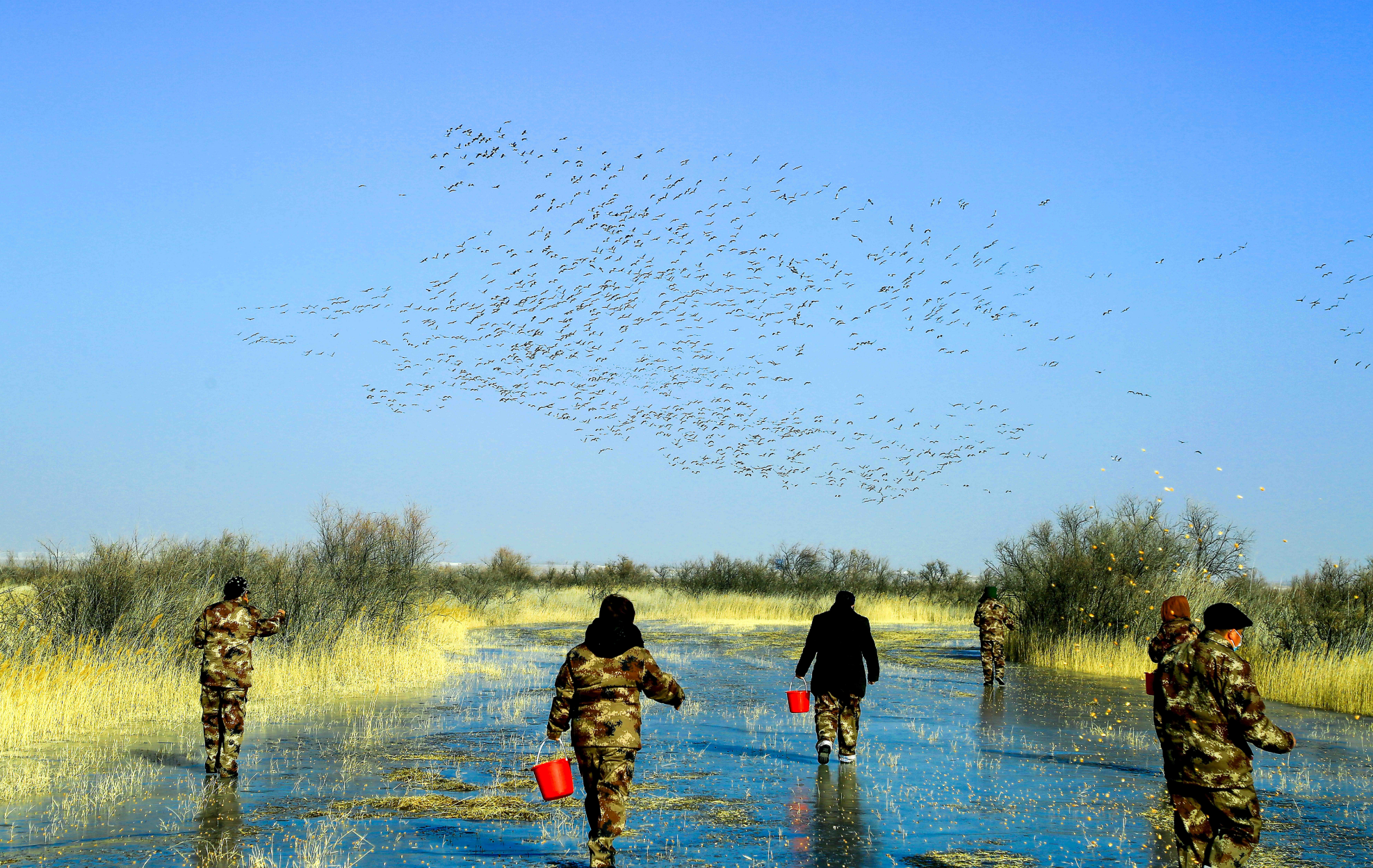 共建美好家園,共享綠水青山。圖為惠農區(qū)禮和鄉(xiāng)銀河村愛鳥護鳥志愿服務隊巡護濕地、投喂候鳥。 陳小組/攝