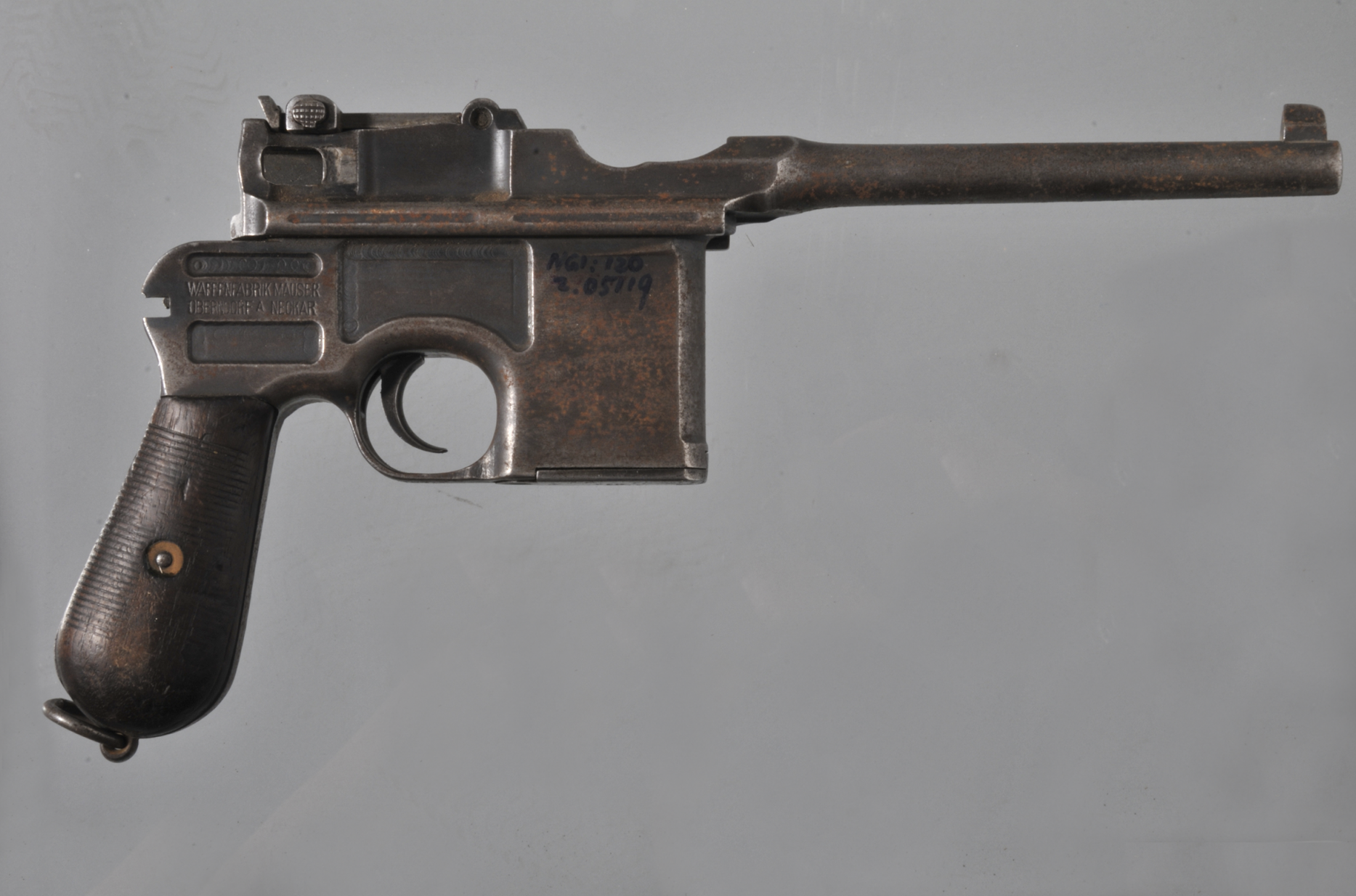 在寧夏博物館“紅旗漫卷”展廳,一把駁殼槍把人們拉回到那個烽火狼煙、鐵血馳騁的戰(zhàn)爭歲月。它長28.8厘米、寬14.5厘米,槍管細長,槍身寬大,手柄木制,柄下端連接一鐵環(huán),槍托缺失,槍身刻有“WWFFENFABRIK MAUSER OBERNDORF A NECKAR”字眼。這把槍的主人,是“海固回民起義”首領之一、回民抗日騎兵團創(chuàng)始人,1955年被授予大校軍銜的馬思義。