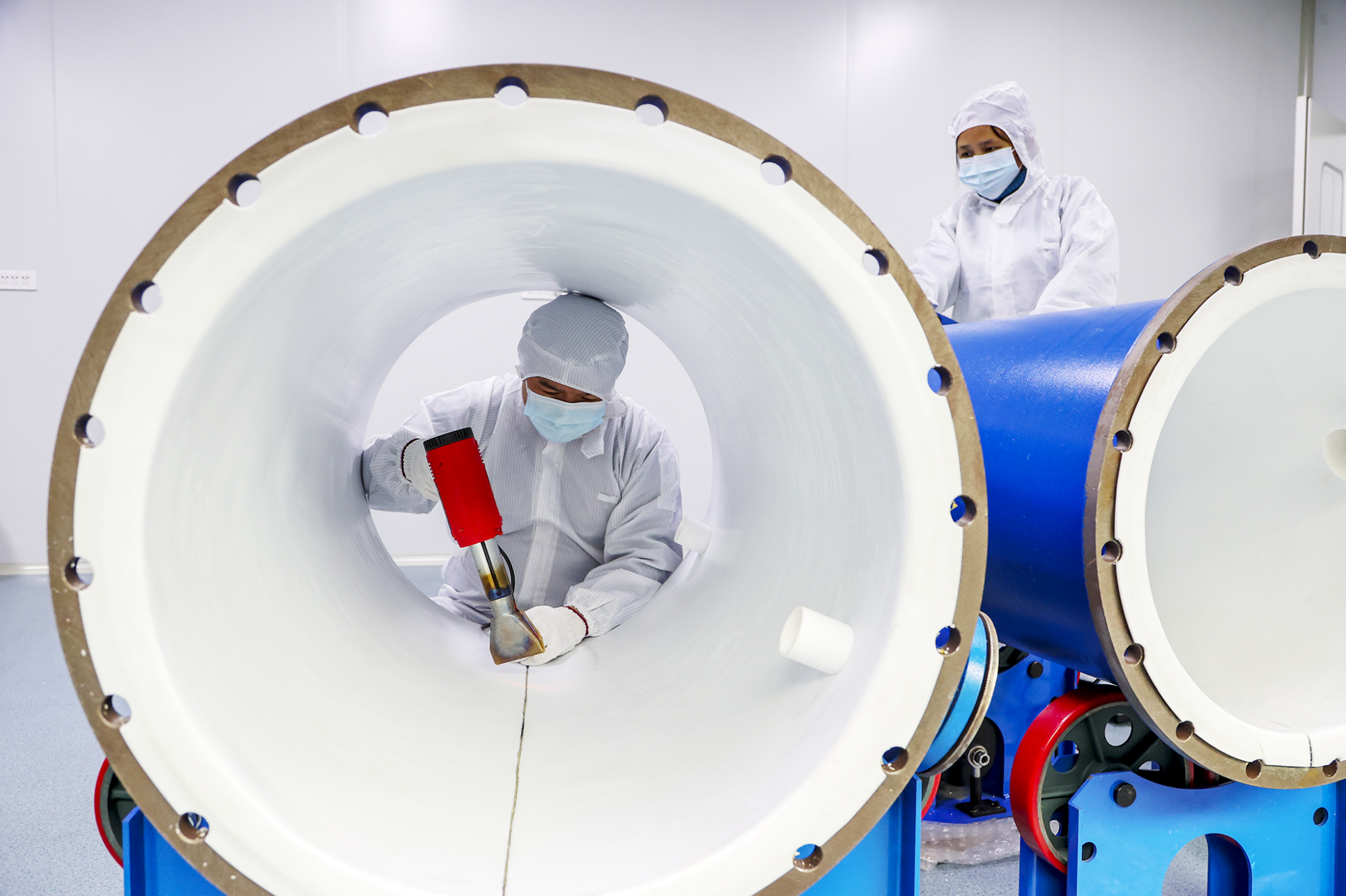在寧夏??擅揽萍加邢薰旧a(chǎn)車間,技術(shù)人員在生產(chǎn)制造氟塑料襯里設(shè)備。 石嘴山市委政研室供圖