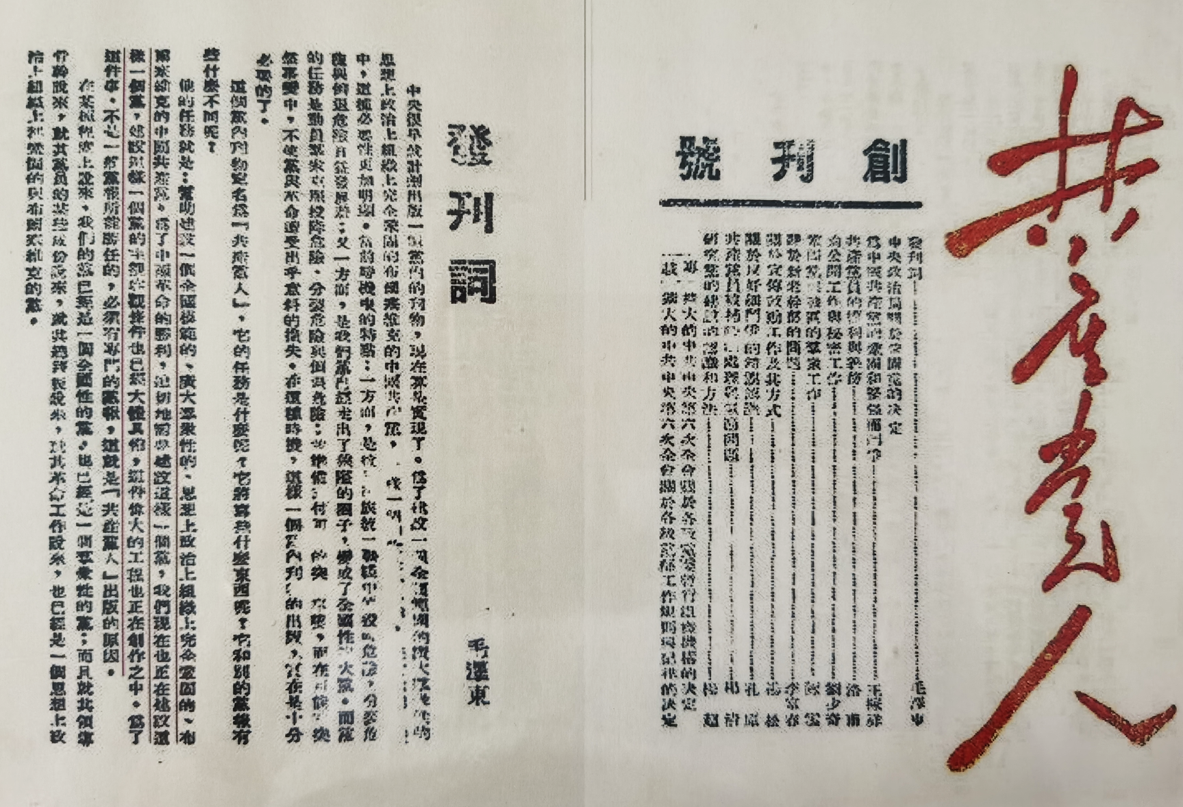 圖為毛澤東同志題寫(xiě)刊名的《共產(chǎn)黨人》創(chuàng)刊號(hào)封面和發(fā)刊詞有關(guān)內(nèi)容。