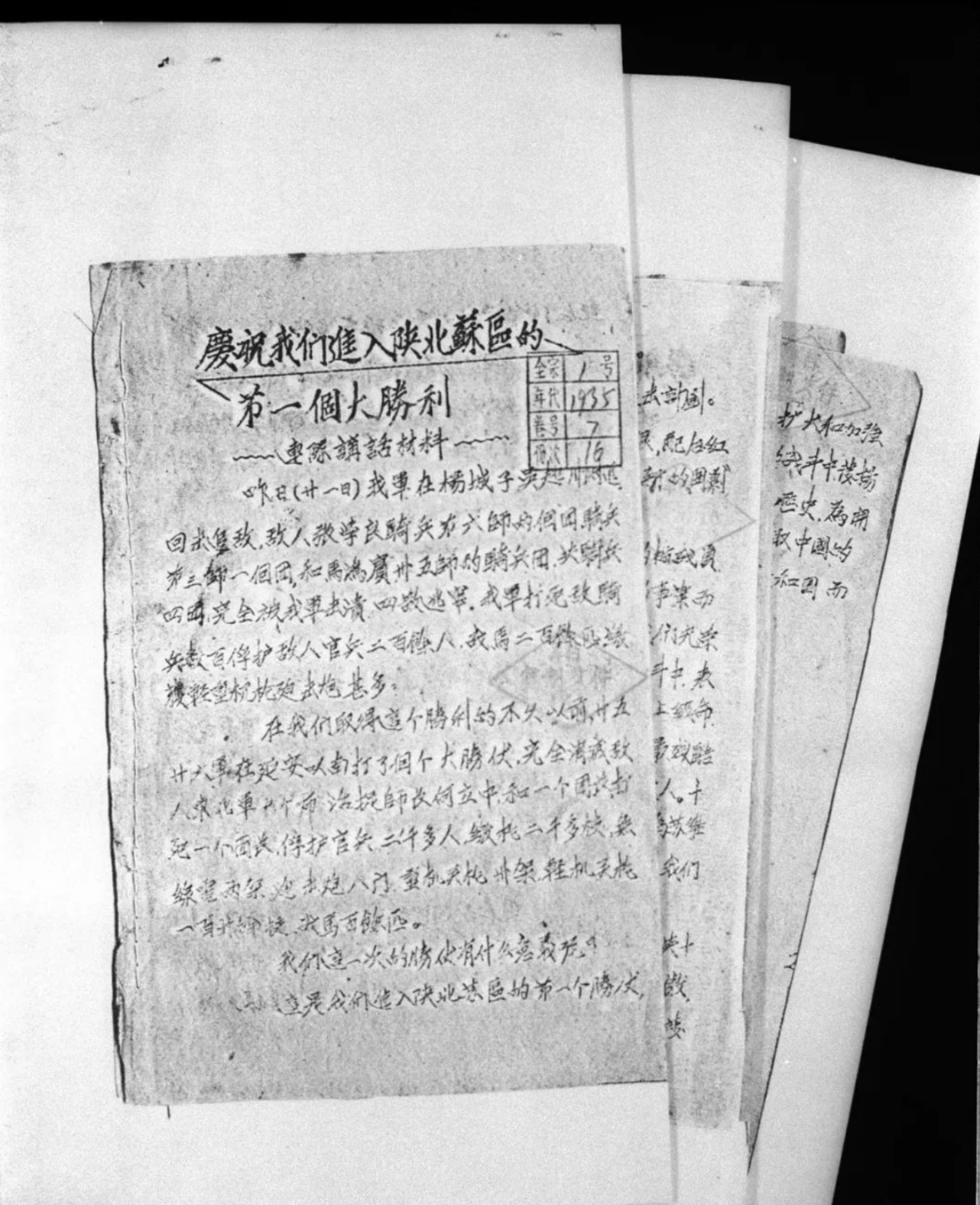 1935年11月22日印發(fā)的直羅鎮(zhèn)戰(zhàn)役捷報(bào)——慶祝我們進(jìn)入陜北蘇區(qū)的第一個(gè)大勝利?!≠Y料圖片