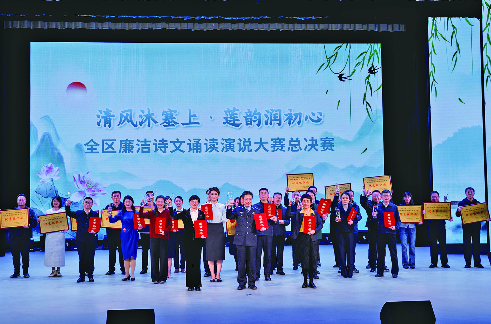 “清風(fēng)沐塞上·蓮韻潤初心”全區(qū)廉潔詩文誦讀演說大賽各獲獎單位代表合影?!∽灾螀^(qū)紀(jì)委監(jiān)委宣傳部供圖
