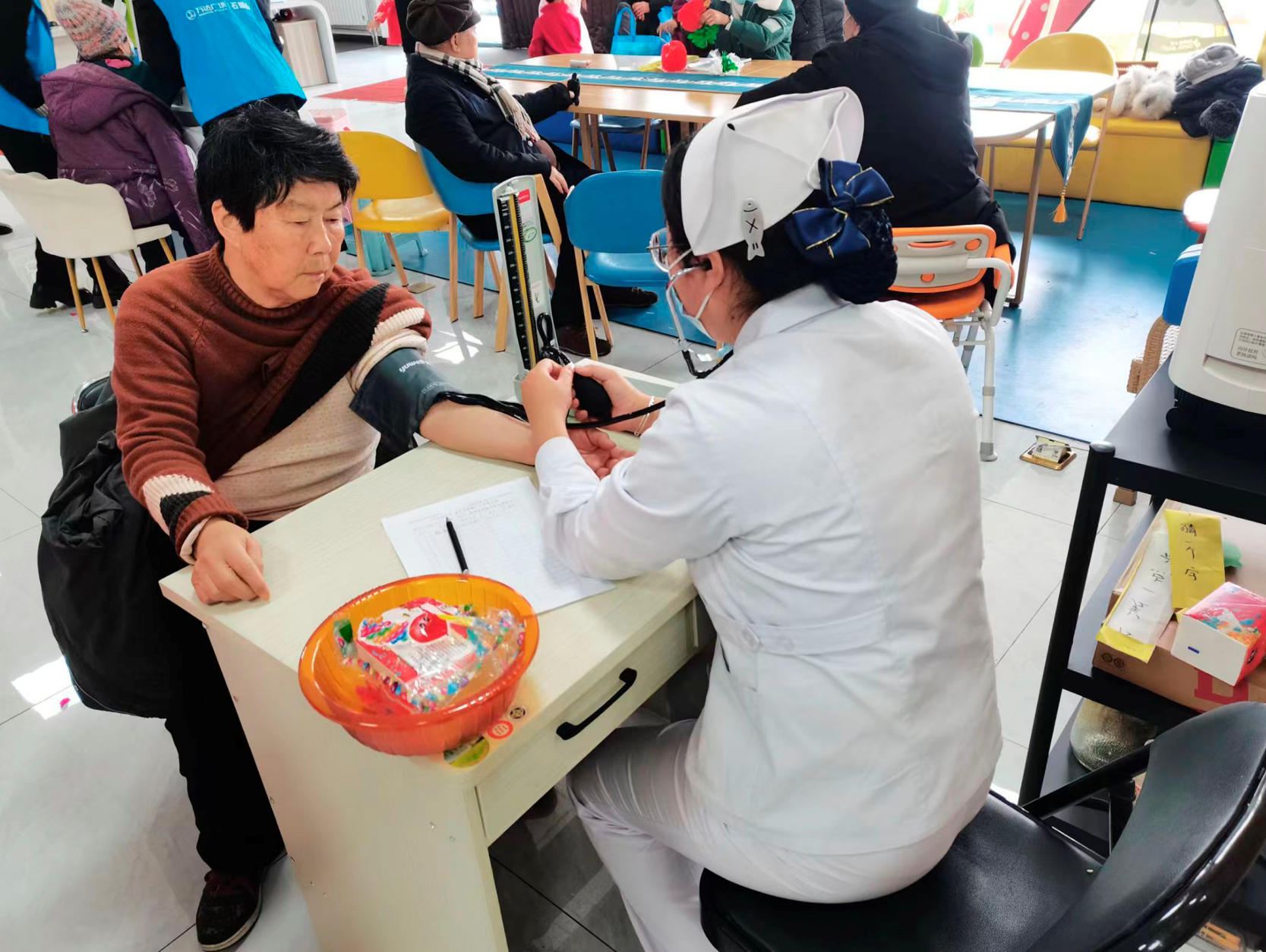 石嘴山市大武口區(qū)朝陽街道綜合養(yǎng)老服務(wù)中心的醫(yī)護人員為轄區(qū)老年人免費量血壓。? 大武口區(qū)朝陽街道辦事處供圖