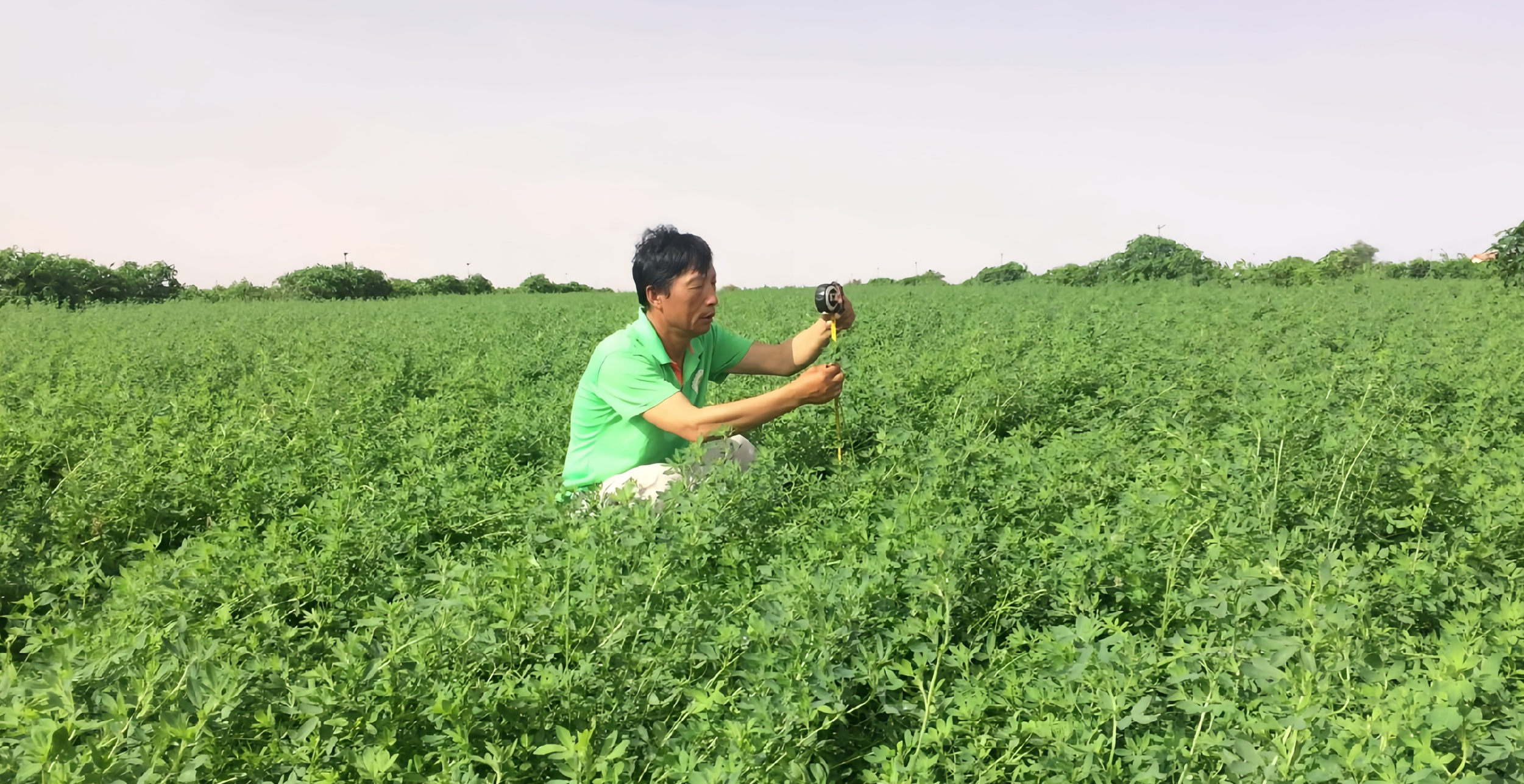 寧夏草原工作站農(nóng)業(yè)技術(shù)推廣研究員任學(xué)山在毛里塔尼亞沙地上成功種植了紫花苜蓿?!∈茉L者供圖