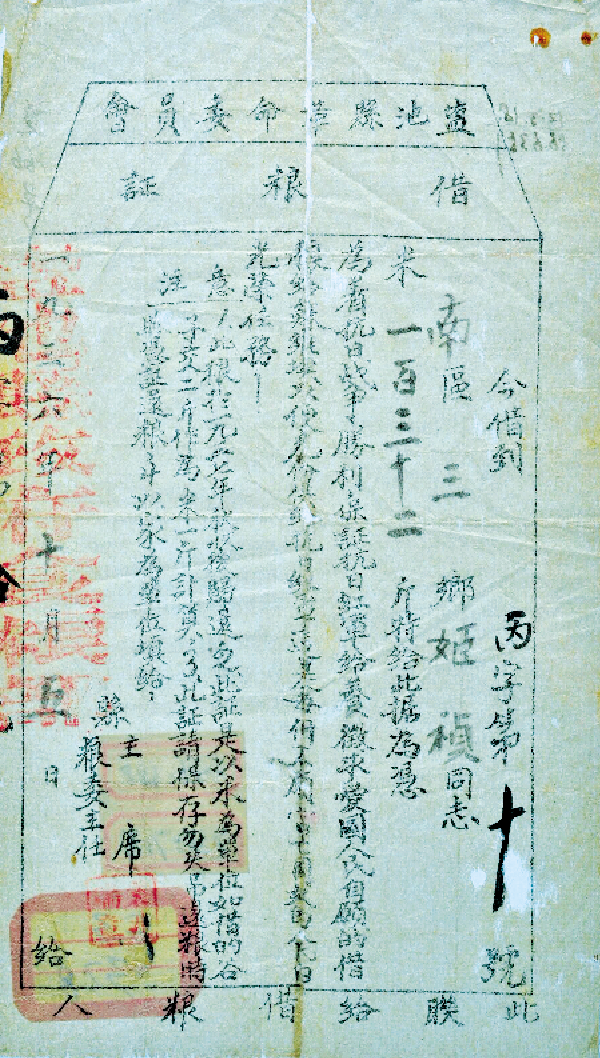 借條的上半部分書寫著“鹽池縣革命委員會借糧證”字樣。借糧證的主體內容從右至左分為四個部分:第一部分為借糧證編號“丙字第十號”,及“今借到南區(qū)三鄉(xiāng)姬禎同志米一百三十二斤特給此據為憑”;第二部分特別寫出了抗日借糧口號,“為了抗日戰(zhàn)爭勝利保證抗日紅軍給養(yǎng)征求愛國人民自愿的借糧給蘇維埃以便充分供給抗日紅軍這是每個不愿當亡國奴的人民的光榮任務!”;第三部分為“注意:1.此糧于一九三七年秋收后歸還;2.此證是以米為單位如借的谷子交二斤作為米一斤計算;3.此證請保存勿失予還糧時照憑證還糧;4.以家為單位填給”;第四部分注明了借糧人為縣主席、糧委主任,蓋“袁兆瑞”章,時間為1936年10月5日。在借條的下半部分,標明“此聯給借糧人”。