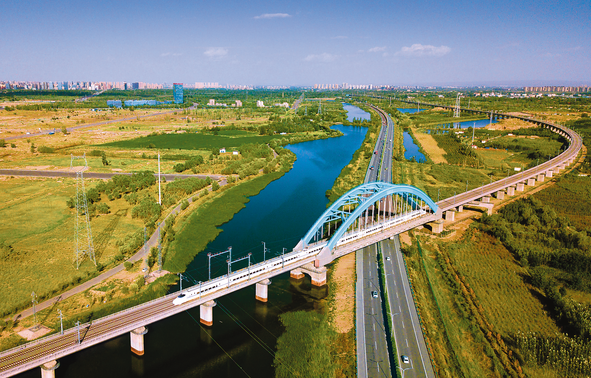 銀西高鐵列車穿行于銀川城郊。 宋佳龍/攝