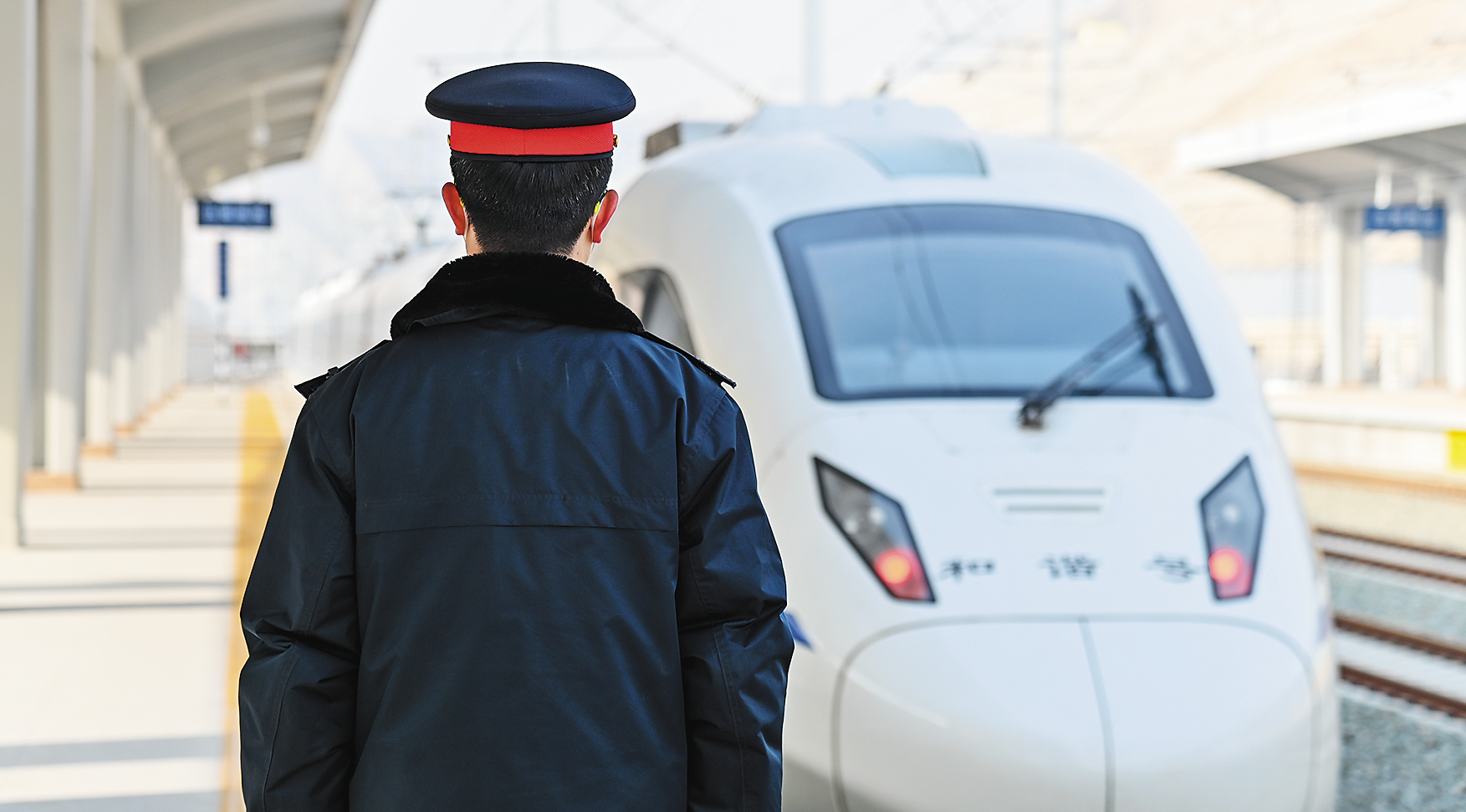 銀蘭高鐵站臺,工作人員與和諧號列車相伴,靜待行程開啟。 中國鐵路蘭州局集團有限公司供圖