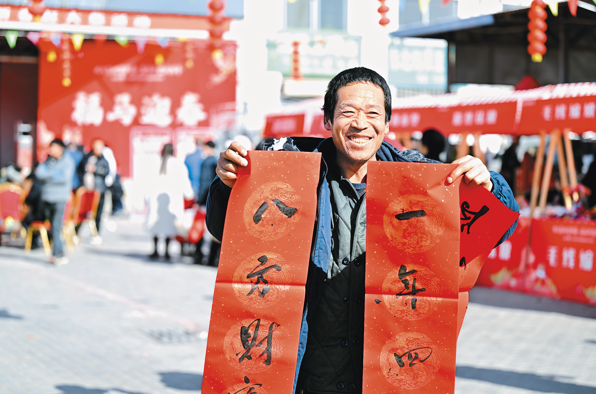 2月11日,“歡天喜地迎新春·五谷豐登慶祥年”銀川市金鳳區(qū)2026年春季村晚暨新春趕大集活動(dòng)在豐登鎮(zhèn)農(nóng)貿(mào)市場(chǎng)正式拉開帷幕,趕集群眾領(lǐng)到春聯(lián),滿心歡喜。 閆院平/攝