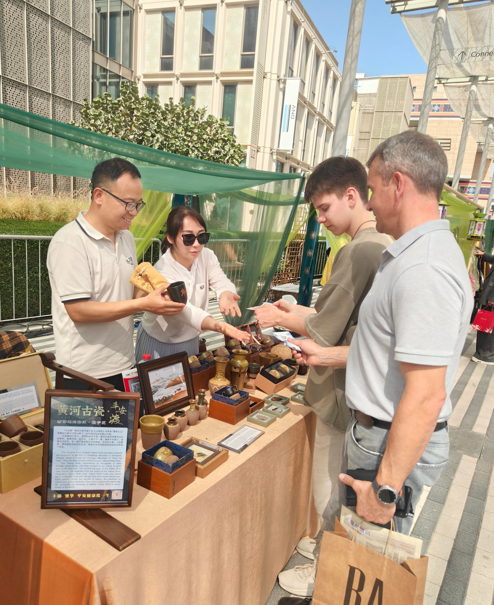 2月8日,中衛(wèi)市的黃河古瓷、羊皮筏子等非遺文創(chuàng)產(chǎn)品走出國(guó)門,亮相迪拜的“溫暖迎春·歡樂(lè)春節(jié)”春節(jié)大巡游慶?;顒?dòng)。圖為外國(guó)客戶正在購(gòu)買中衛(wèi)文創(chuàng)產(chǎn)品。 中衛(wèi)市委宣傳部供圖