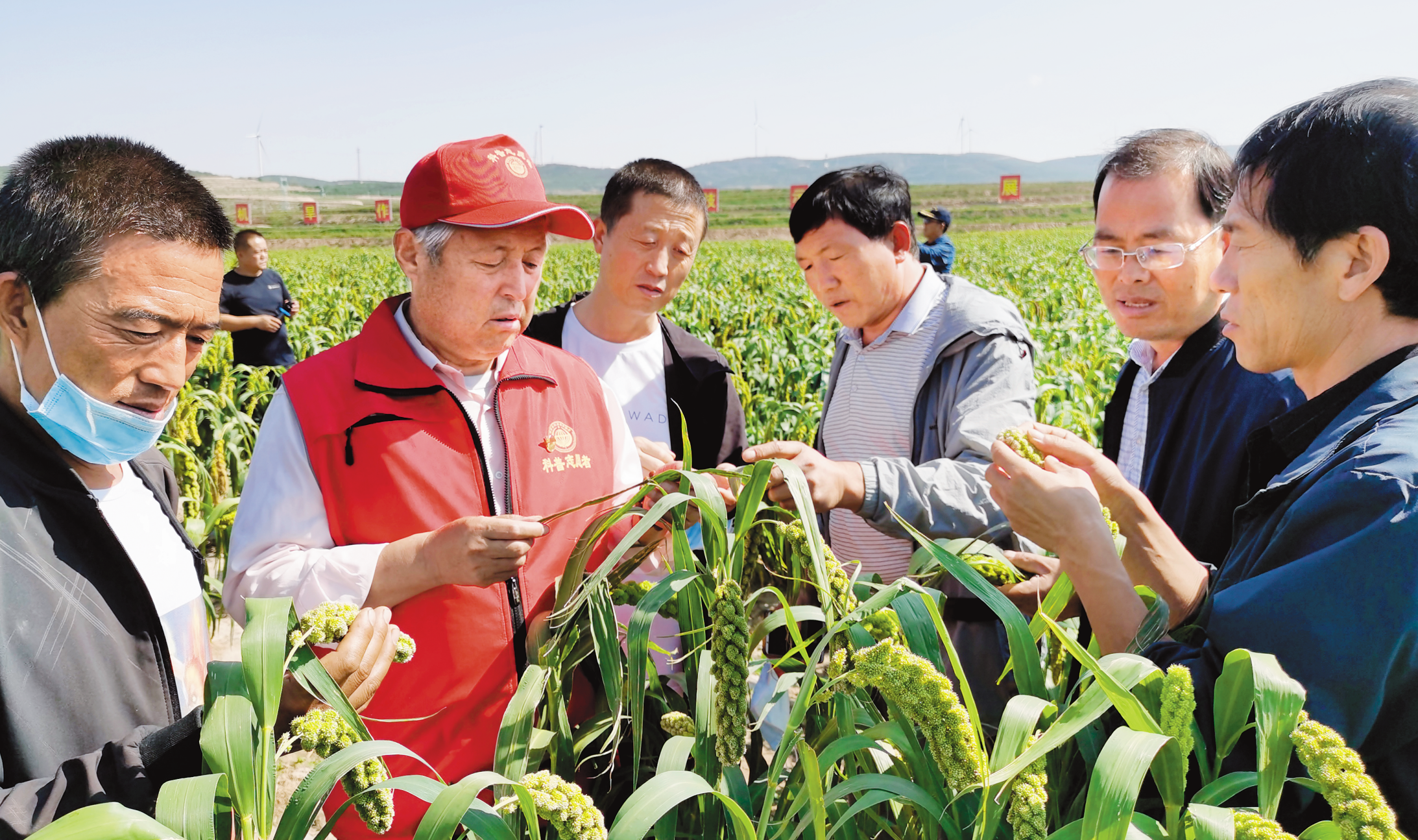 蔣儒齡(前排左二)在小雜糧田間察看谷子新品種的生長情況。 受訪者供圖
