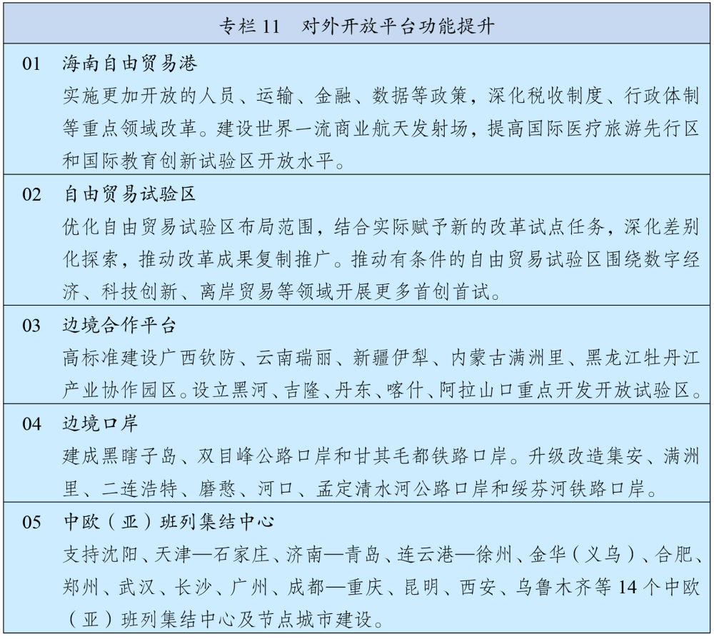支持香港鞏固提升國際金融、航運、貿(mào)易中心和國際航空樞紐地位,強化全球離岸人民幣業(yè)務(wù)樞紐、國際資產(chǎn)及財富管理中心、國際風(fēng)險管理中心功能,構(gòu)建大宗商品交易生態(tài)圈和高增值供應(yīng)鏈服務(wù)中心。支持香港建設(shè)國際創(chuàng)新科技中心,深化國際法律及解決爭議服務(wù)中心、區(qū)域知識產(chǎn)權(quán)貿(mào)易中心、中外文化藝術(shù)交流中心建設(shè),加快北部都會區(qū)建設(shè)。支持澳門經(jīng)濟適度多元發(fā)展,深化世界旅游休閑中心、中國與葡語國家商貿(mào)合作服務(wù)平臺和以中華文化為主流、多元文化共存的交流合作基地建設(shè),提升中醫(yī)藥大健康、特色金融、高新技術(shù)、會展商貿(mào)等產(chǎn)業(yè)競爭力。支持港澳打造國際高端人才集聚高地。