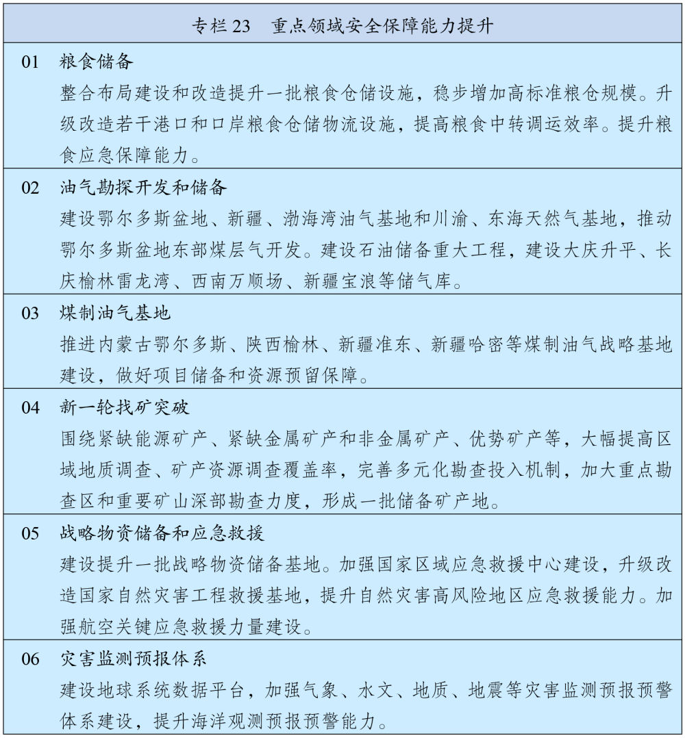 堅持立足國內(nèi)、補齊短板、多元保障、強化儲備,加強能源產(chǎn)供儲銷體系建設(shè)。堅持油氣核心需求自主保障,實施中長期油氣增儲上產(chǎn)戰(zhàn)略行動,確保原油年產(chǎn)量穩(wěn)定在2億噸左右、天然氣產(chǎn)量穩(wěn)步增長,加強煤制油氣產(chǎn)能和技術(shù)儲備。強化政府儲備和企業(yè)儲備協(xié)同,提升國家石油儲備規(guī)模,建立更加靈活的輪換動用機制,增強天然氣儲備調(diào)節(jié)保障能力,完善煤炭儲備體系。健全能源保供中長期合同制度,完善電力應(yīng)急調(diào)度機制和備用電源配置,強化能源需求側(cè)管理。加強戰(zhàn)略性礦產(chǎn)資源勘探開發(fā)和儲備,深入實施新一輪找礦突破戰(zhàn)略行動,統(tǒng)籌加強產(chǎn)品、產(chǎn)能和產(chǎn)地儲備,推動大宗商品儲運基地建設(shè),提升戰(zhàn)略性礦產(chǎn)資源安全風(fēng)險監(jiān)測預(yù)警和應(yīng)急保供水平。加強能源資源開發(fā)國際合作,維護(hù)戰(zhàn)略通道安全。