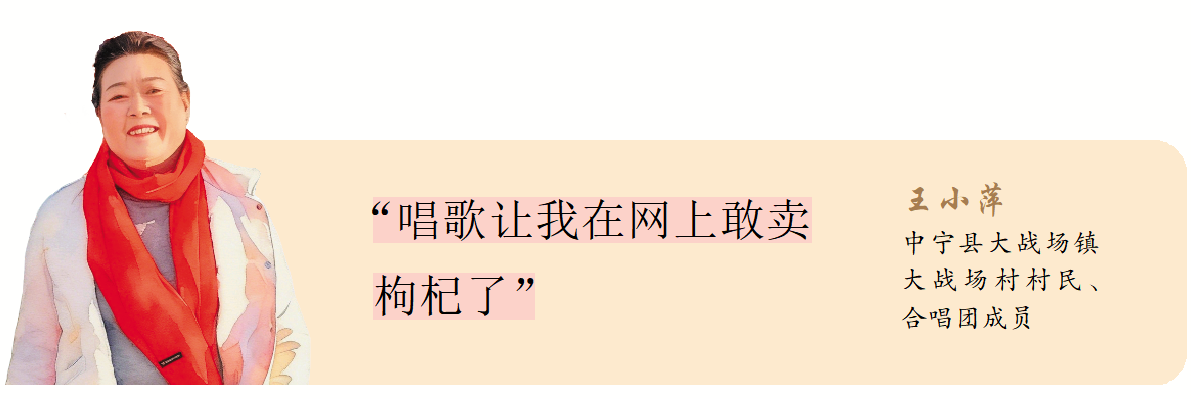 人有了精氣神,腦子也跟著活泛了。去年我們在延安參加首屆中國文明鄉(xiāng)風(fēng)大會(huì),演唱了《我們的故事,我們的歌》,里頭有句詞是我說的:“唱歌讓我在網(wǎng)上敢賣枸杞了?!边@句詞說的就是我的經(jīng)歷。