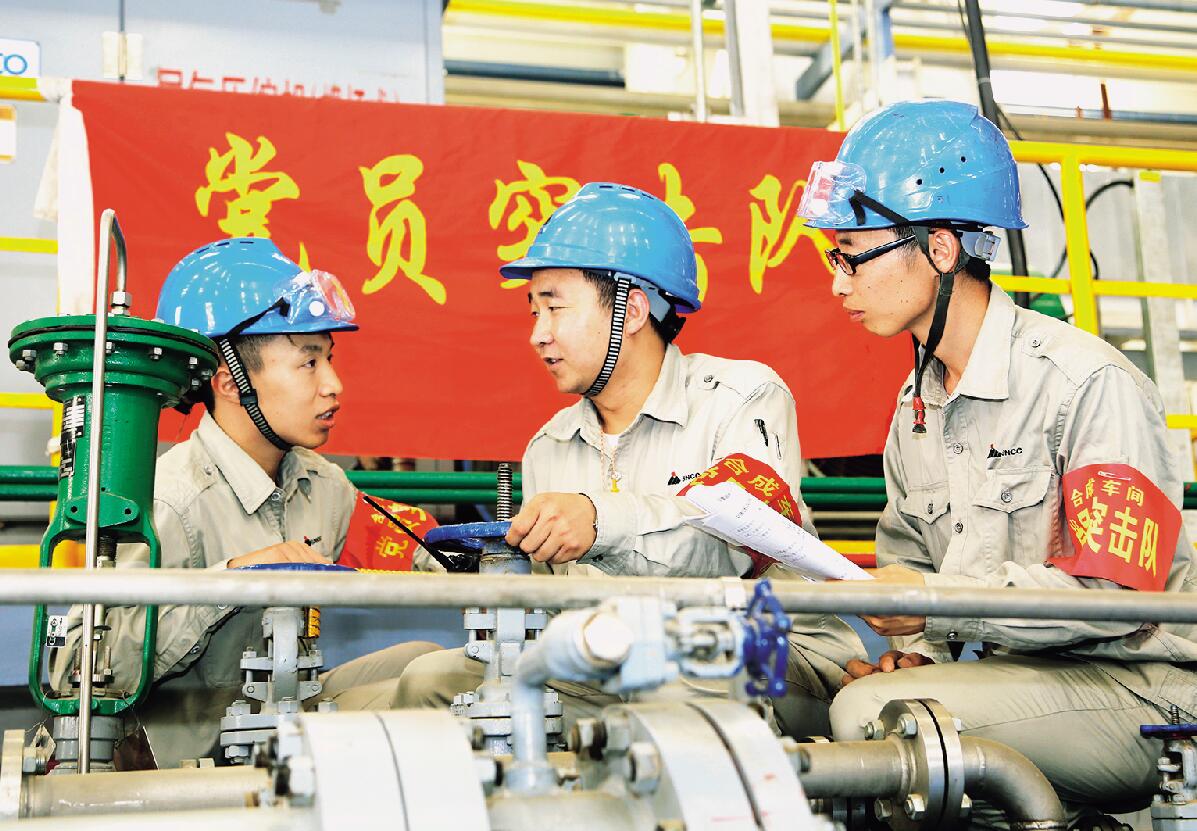神華寧煤烯烴公司基層黨員突擊隊(duì)隊(duì)員在裝置現(xiàn)場技術(shù)攻關(guān)?