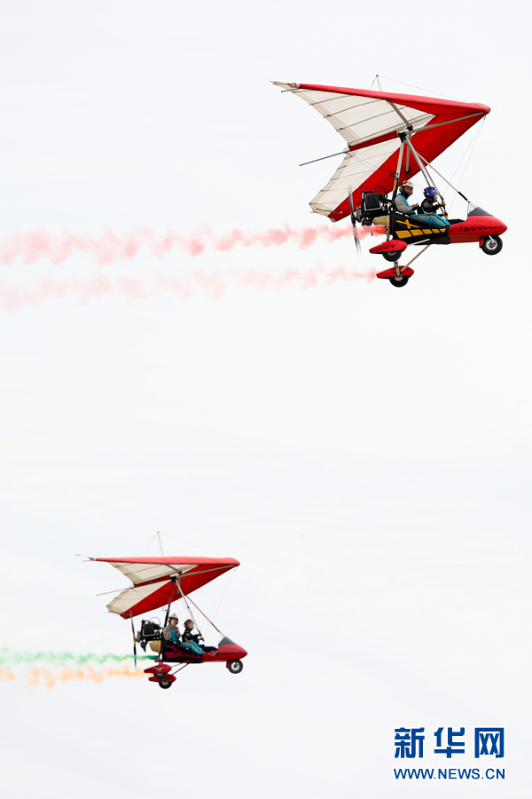8月14日,表演者在開幕式上進(jìn)行動力三角翼飛行表演。