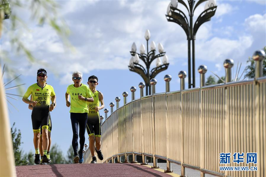 在寧夏銀川,顧大我(中)與鐵人三項(xiàng)俱樂(lè)部的隊(duì)友們一起進(jìn)行跑步訓(xùn)練(7月26日攝)。 新華社記者 馮開(kāi)華 攝