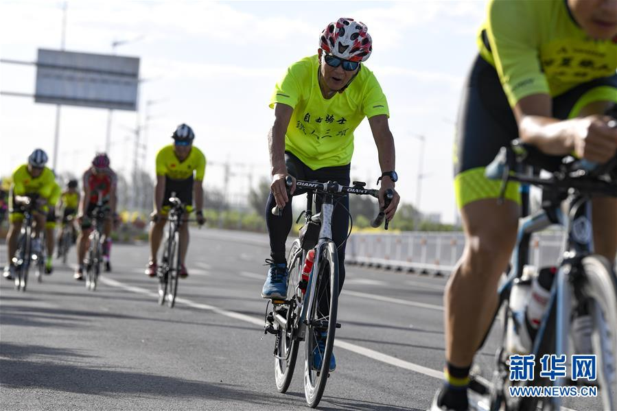 在寧夏銀川,顧大我(右二)與鐵人三項(xiàng)俱樂(lè)部的隊(duì)友們一起進(jìn)行騎行訓(xùn)練(7月26日攝)。 新華社記者 馮開(kāi)華 攝