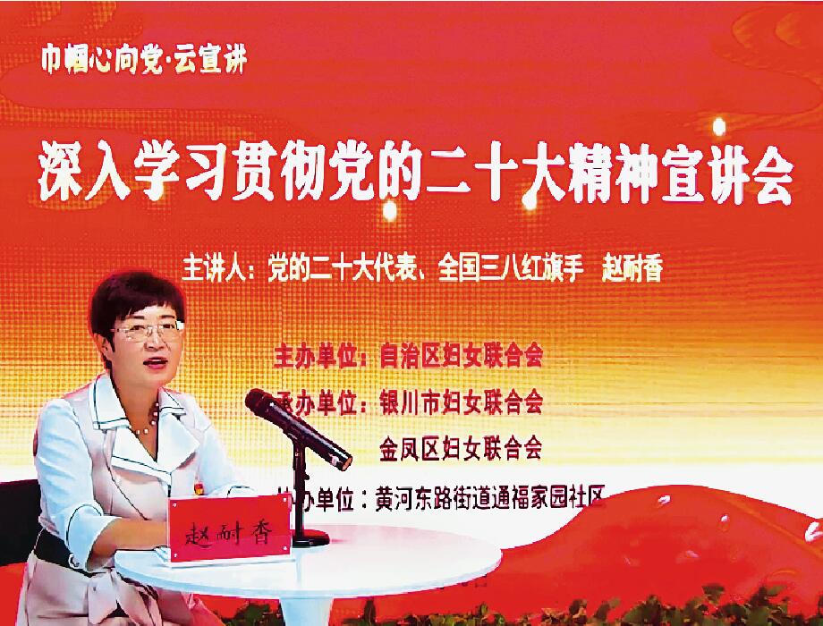 隔空對(duì)接“云宣講”。各級(jí)婦聯(lián)上下聯(lián)動(dòng)、同頻共振,線上舉辦3場(chǎng)“巾幗心向黨·云宣講”直播活動(dòng),邀請(qǐng)黨的二十大代表趙耐香、陳美榮、楊彥鋒等結(jié)合參加黨的二十大的所見(jiàn)所聞、切身感受和工作實(shí)踐進(jìn)行宣講,全區(qū)各級(jí)婦聯(lián)干部、執(zhí)委和婦女群眾5.66萬(wàn)余人通過(guò)收聽(tīng)收看直播聆聽(tīng)宣講。自治區(qū)婦聯(lián)在寧夏廣播電臺(tái)開(kāi)設(shè)“女性之聲”專欄,連線黨的二十大代表解讀黨的二十大精神。銀川市婦聯(lián)聯(lián)合銀川都市經(jīng)濟(jì)廣播電臺(tái)開(kāi)設(shè)專欄,邀請(qǐng)黨的二十大代表走進(jìn)直播間,面向廣大婦女群眾開(kāi)展“云端”宣講。