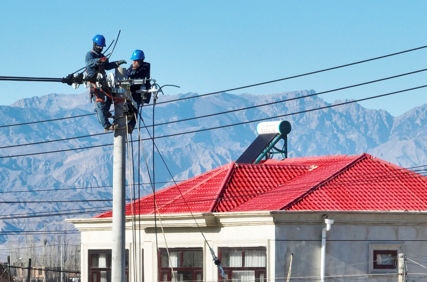 國網(wǎng)永寧縣供電公司施工人員正在閩寧鎮(zhèn)福寧村北二組開展煤改電項目立桿架線作業(yè)。 袁宏彥/攝